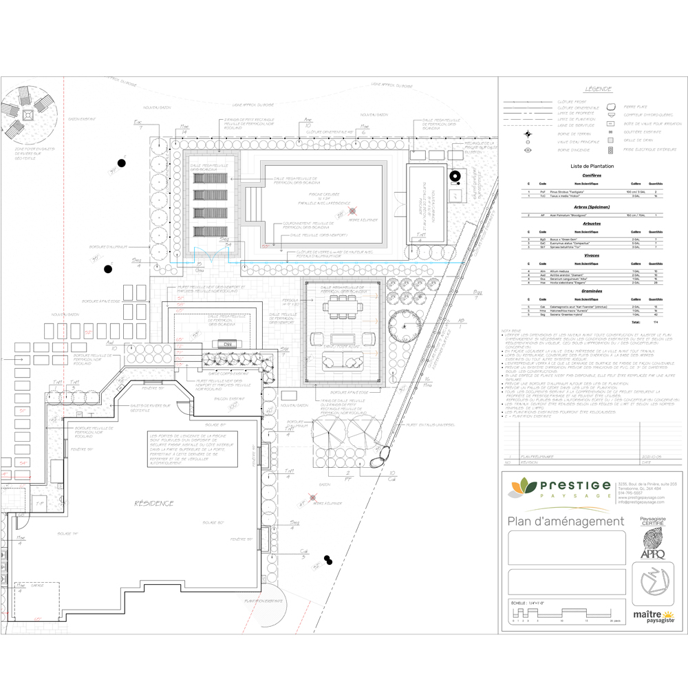 Avant de donner le premier coup de pelle, notre chargé de projet vous présente le plan d’aménagement extérieur final en trois dimensions pour visualiser parfaitement chaque aspect. C’est ici que notre planification méthodique prend tout son sens car le plan guide notre travail jusqu’à ce que votre cour soit exceptionnelle. Nous vous expliquons en détail le devis technique et l’échéancier. Et nous ne repartons pas sans avoir répondu à toutes vos questions. Parce que chez Prestige Paysage, l’excellence rime aussi avec la transparence.