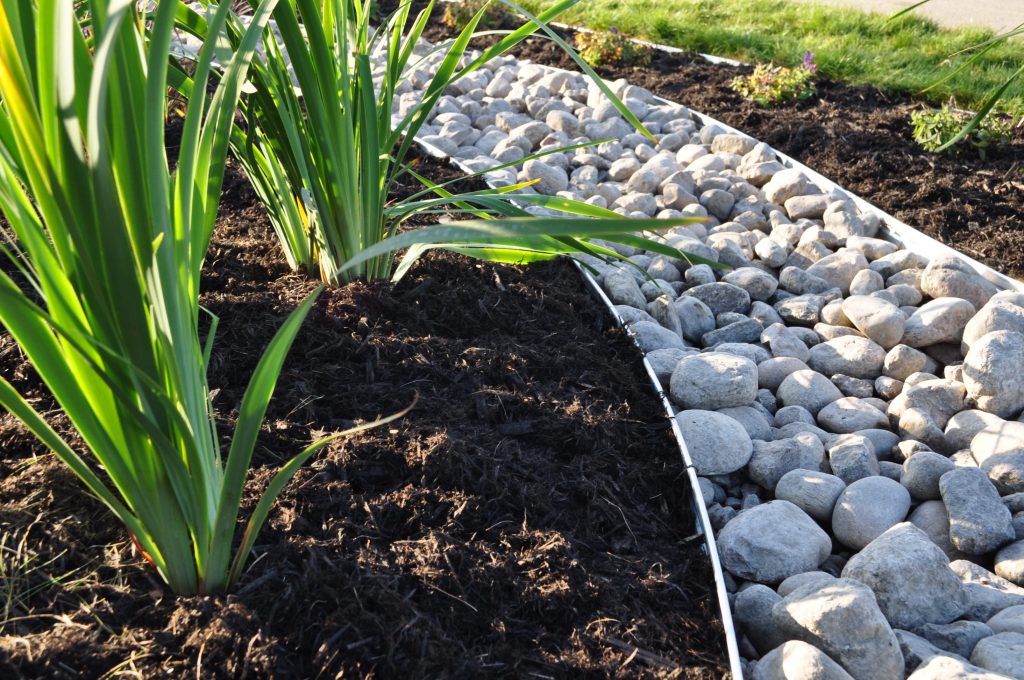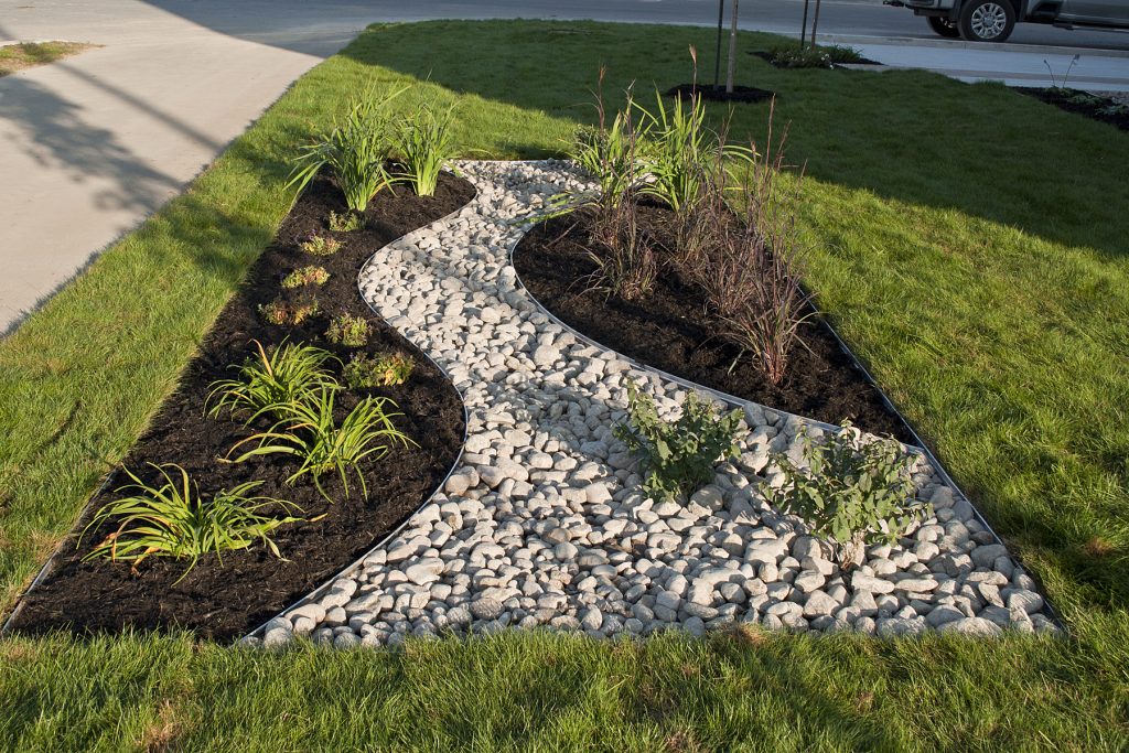 6- Le choix des végétaux et des pierres. Ces choix dépendent de vos goûts personnels, mais les plantes doivent tout de même être choisies en fonction de leur tolérance aux accumulations d’eau, et aux courtes périodes de sécheresse. De plus, les plantes indigènes sont souvent beaucoup plus faciles d’entretien. Il peut aussi être intéressant de tenir compte des périodes de floraison des différentes espèces végétales utilisées pour que le jardin pluvial soit esthétique durant toute la saison de croissance. Par contre, veillez à éviter les plantes envahissantes problématiques au Québec. Les jardins pluviaux peuvent être aménagés au printemps lorsque les plants sont transplantés directement dans le jardin, ou à l’automne lorsqu’on procède par ensemencement (graines). Les deux méthodes sont conseillées, mais l’ensemencement, bien que moins coûteuse que l’achat de plantules à transplanter, entraîne une implantation plus lente des végétaux, pouvant aller jusqu’à trois ans dans certains cas.