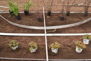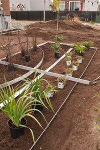 3- Infiltration de l’eau dans le sol. L’eau doit s’infiltrer lentement dans le sol du jardin pluvial, et ne pas s’accumuler en permanence. Optimalement, l’eau devrait réussir à s’infiltrer dans le sol en deux jours. On peut faire un essai avant la construction du jardin en creusant un trou dans le sol et en y versant une quantité précise d’eau afin de voir combien de temps l’eau mettra pour s’infiltrer. Si l’infiltration est trop lente, souvent en raison d’une teneur en argile supérieure à 10 %, on peut excaver la couche de sol des vingt centimètres supérieurs, ameublir le sol, et y mélanger des matériaux plus poreux comme du sable, du gravillon ou des matières organiques. De plus, la surface du jardin devrait se trouver à au moins 1 m au-dessus de la nappe phréatique. On peut vérifier la hauteur du niveau de la nappe phréatique en creusant une fosse étroite mais profonde par temps sec et en regardant le niveau de l’accumulation d’eau à l’intérieur. On peut aussi s’informer auprès de sa municipalité.