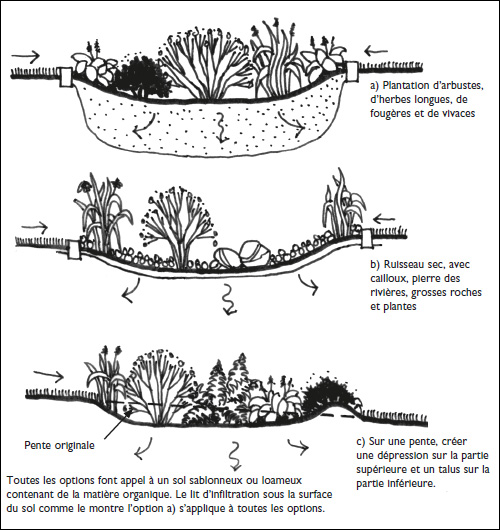 C’est l’objectif visé par les jardins pluviaux, ou jardins de pluie. Ces jardins visent à utiliser les eaux de ruissellement afin d’irriguer des plantes adaptées aux accumulations d’eau, mais aussi à certaines périodes de sécheresse, et surtout à laisser le temps nécessaire à l’eau de s’infiltrer correctement dans le sol.