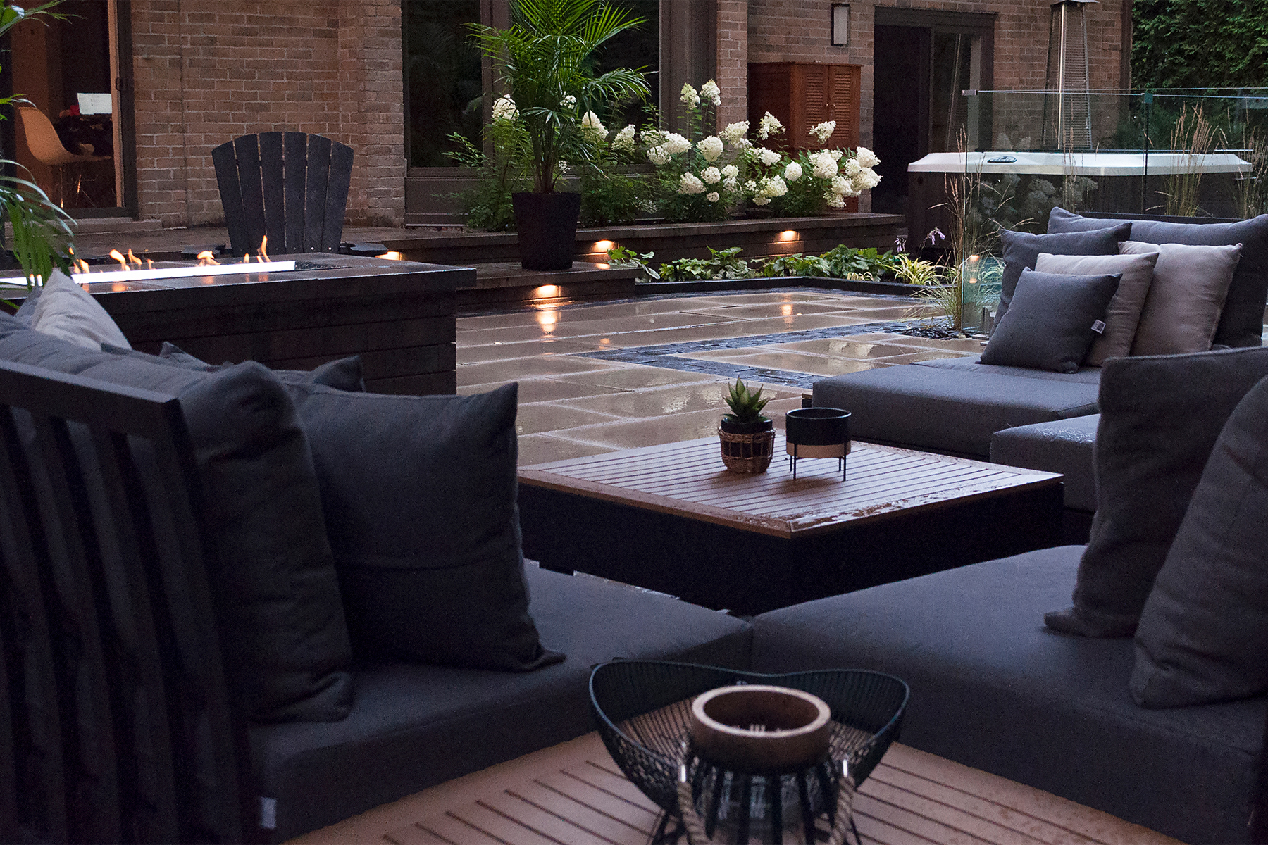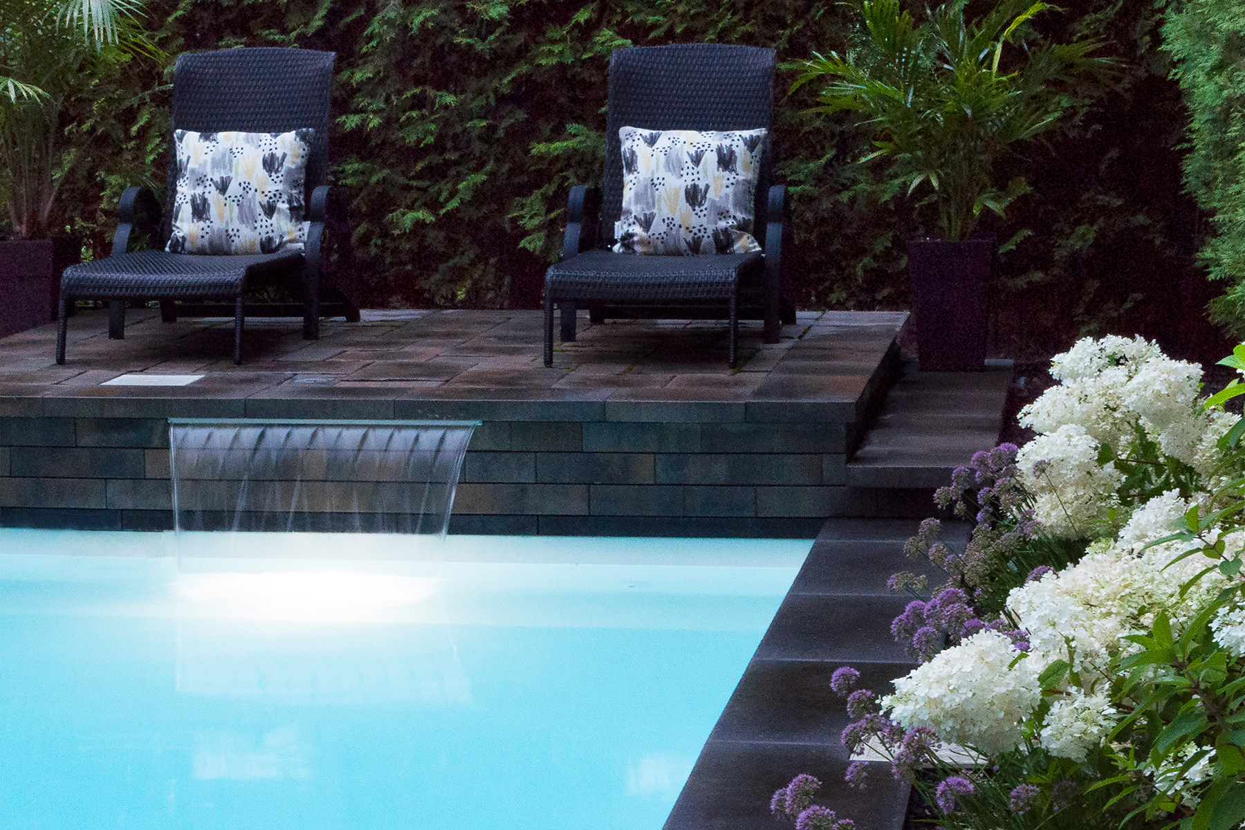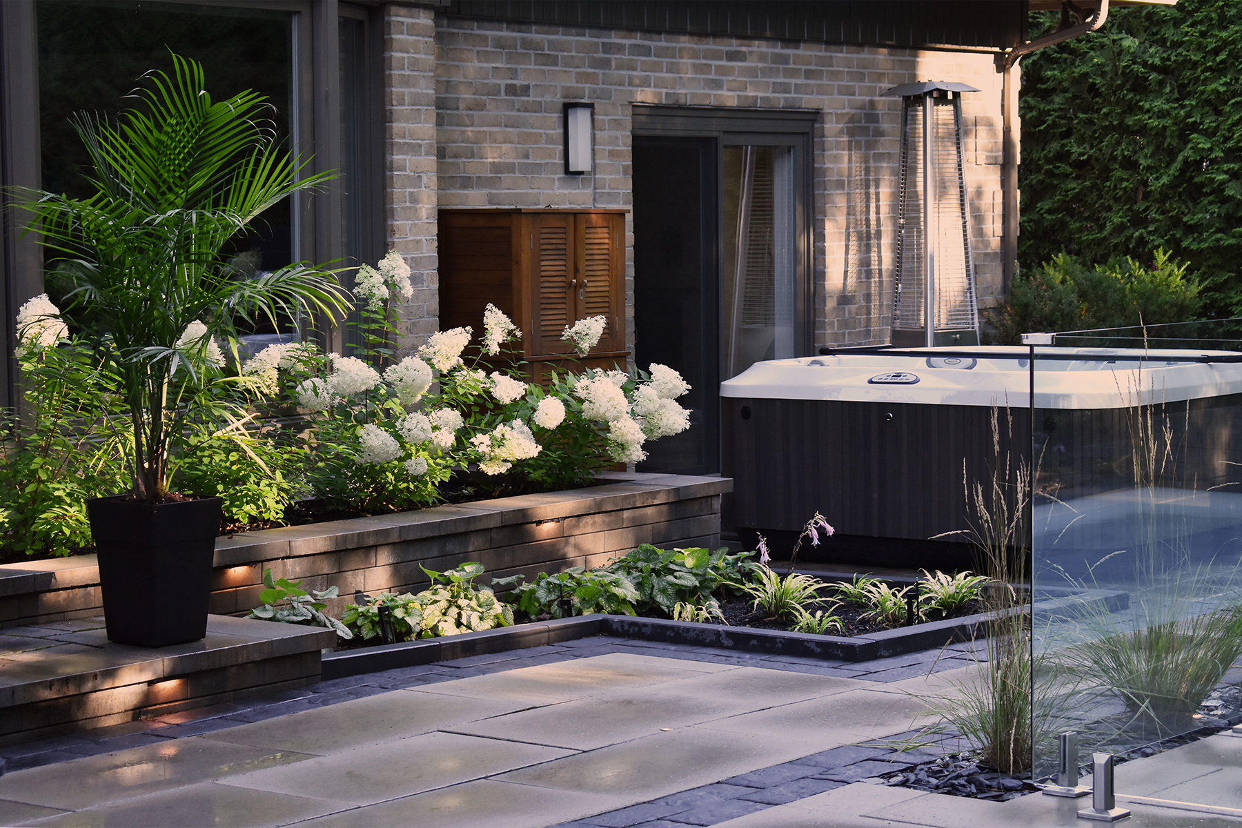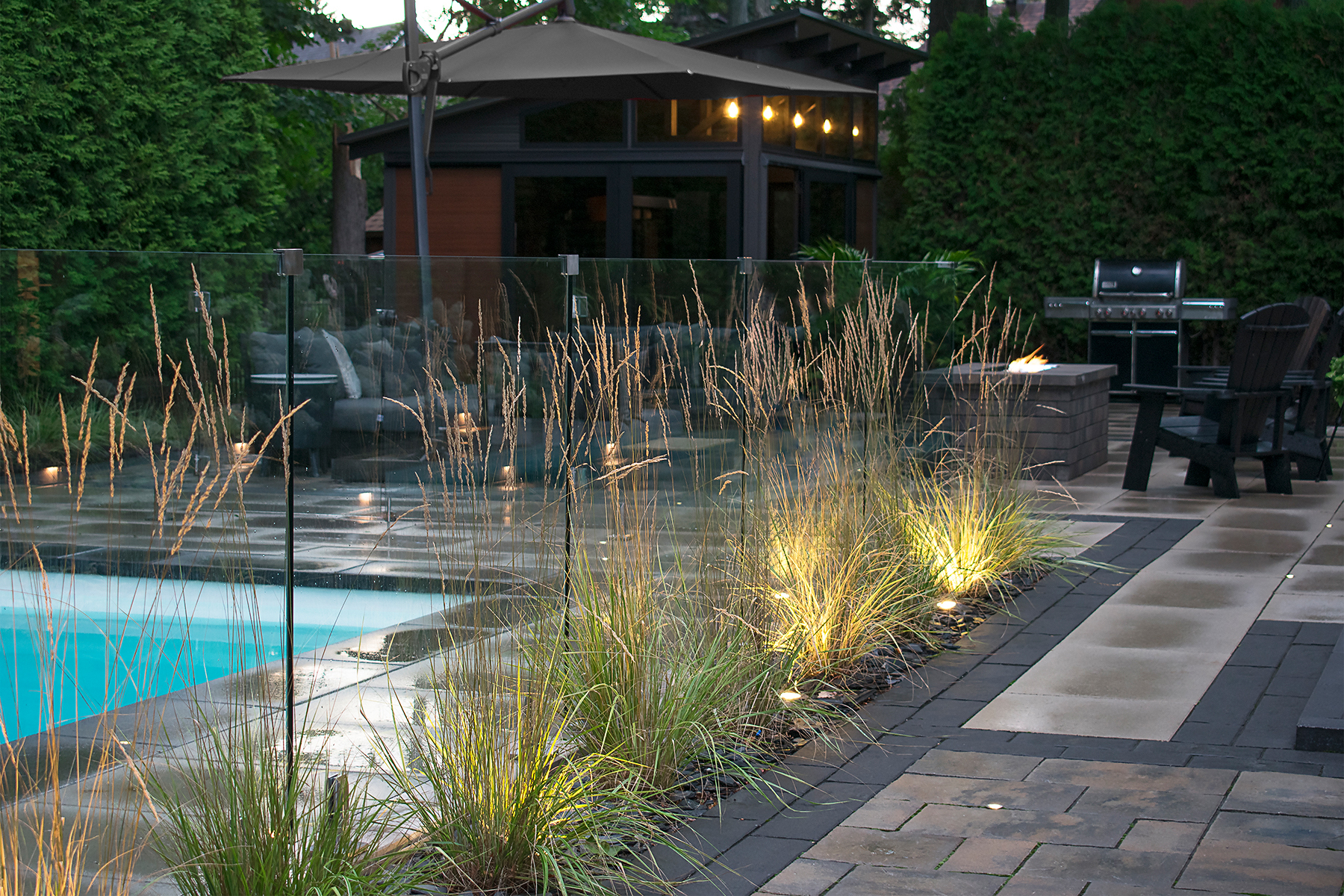L’éclairage paysager, discret et fonctionnel sécurise les lieux lors de la tombée de la nuit.