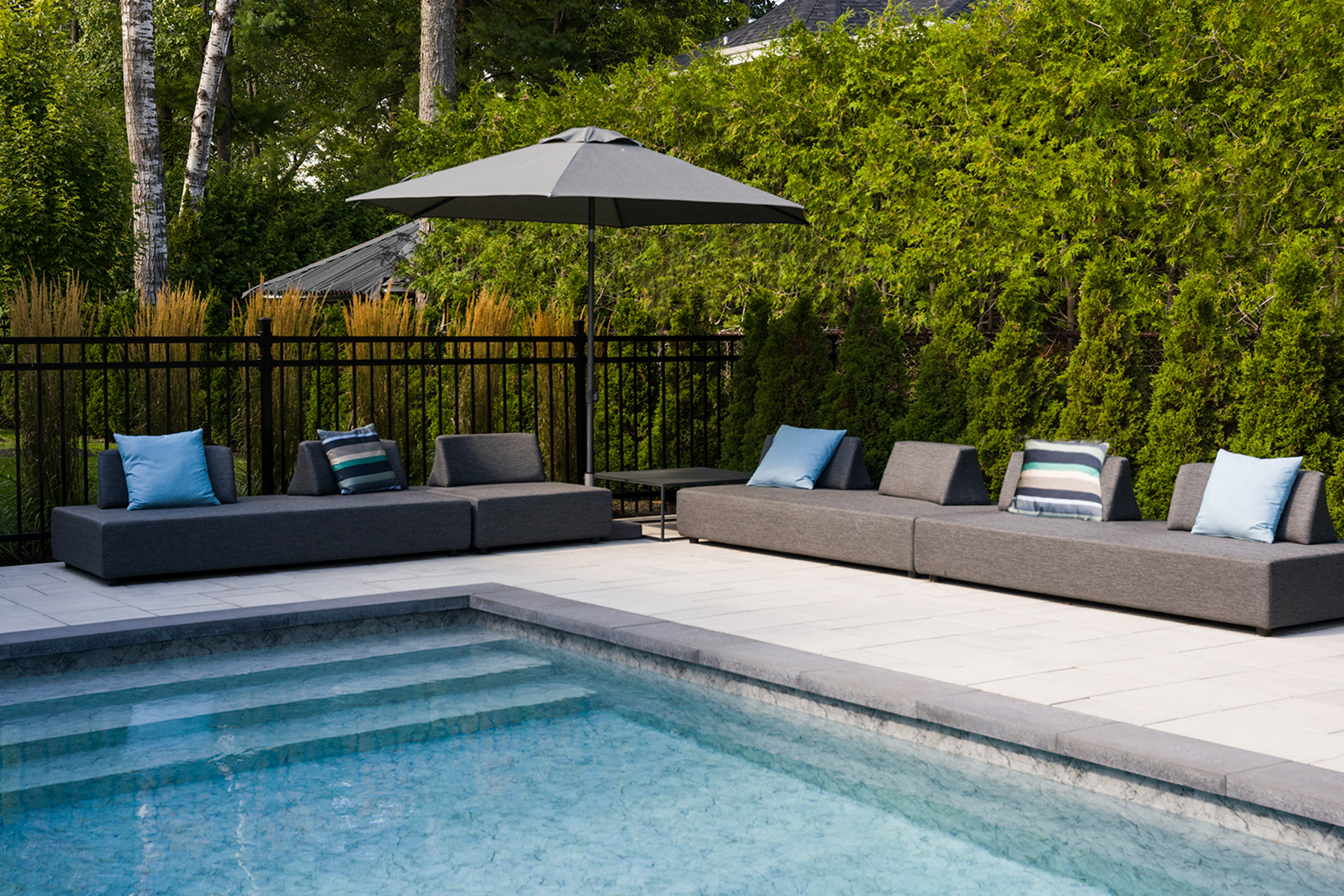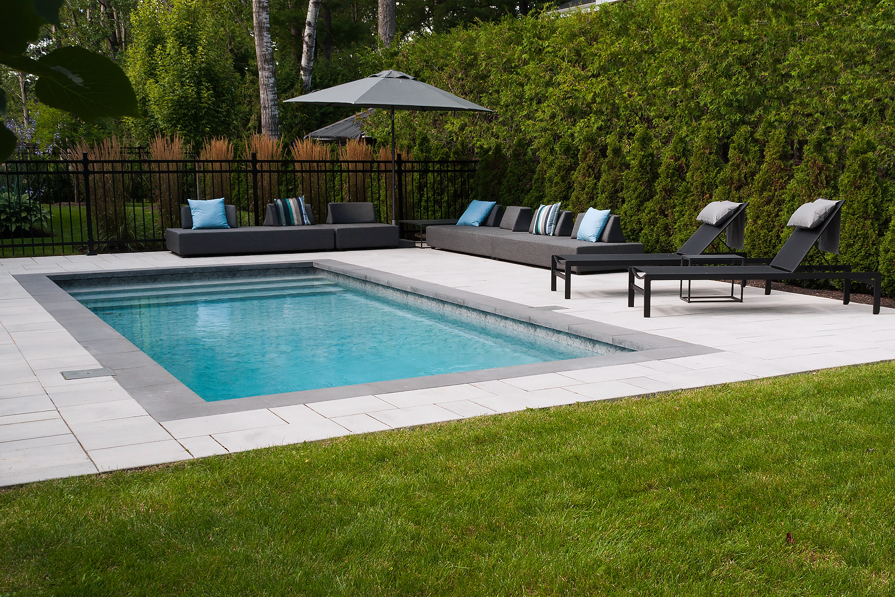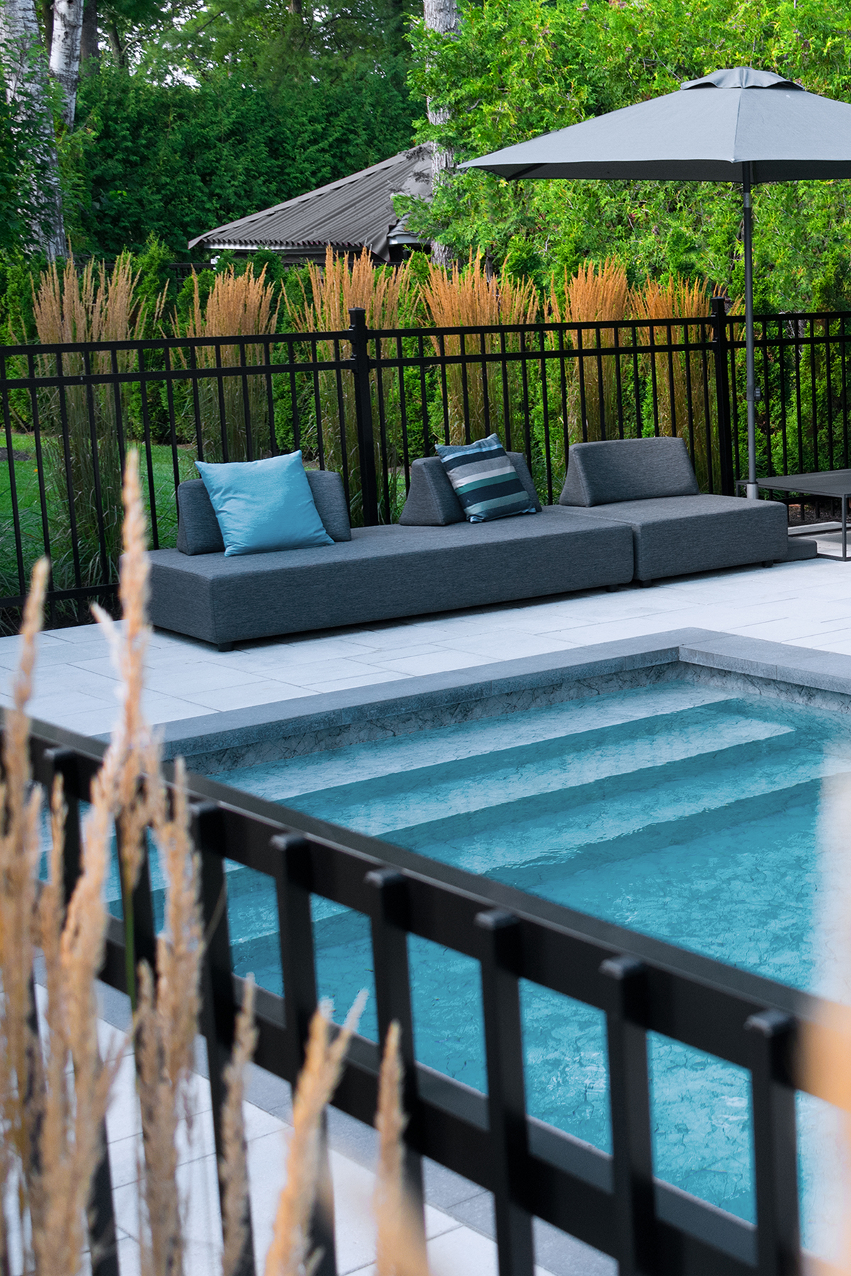 Une nouvelle construction, un terrain restreint, mais l’aménagement de cet espace piscine se veut convivial et accueillant.