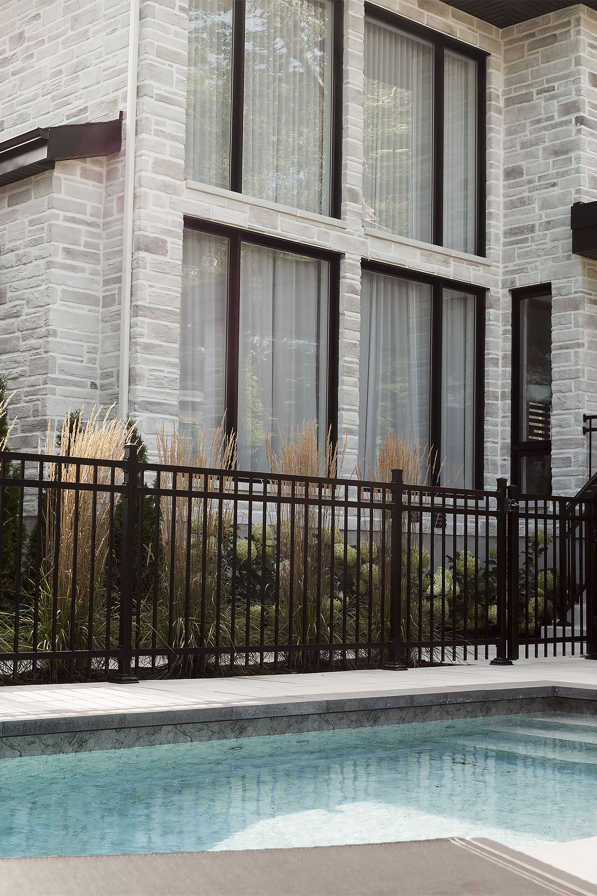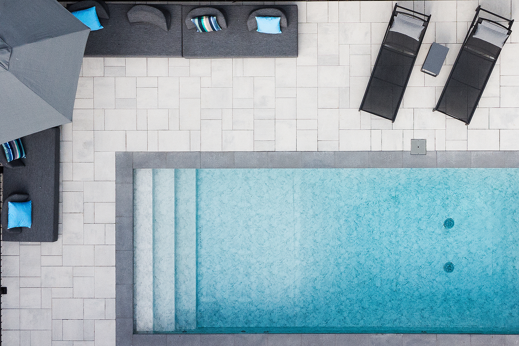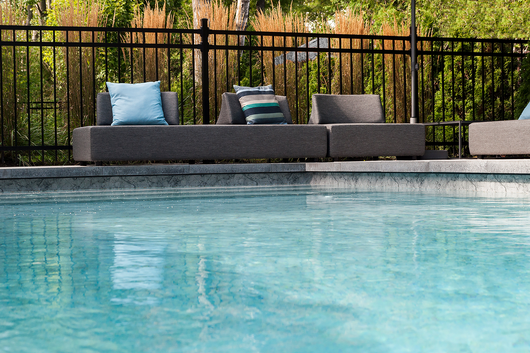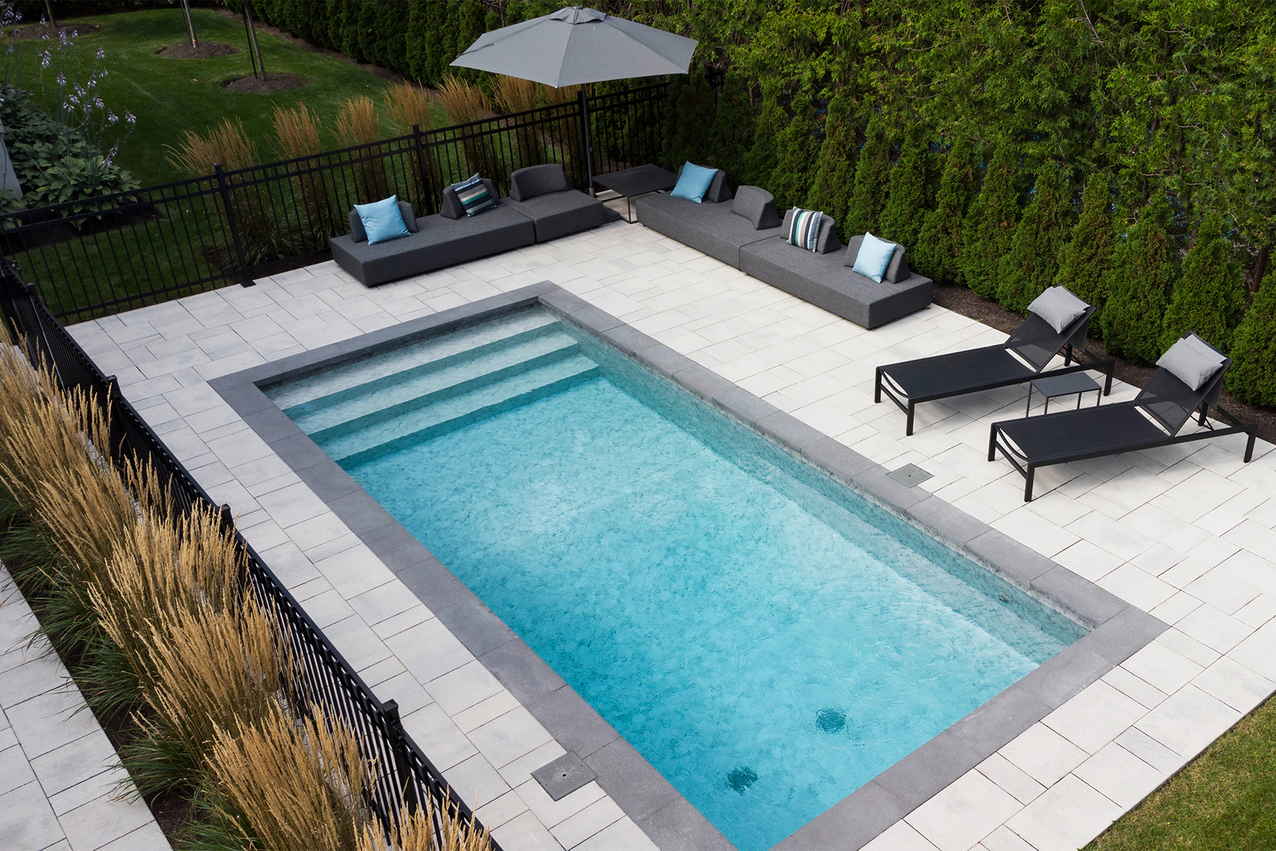 Une nouvelle construction, un terrain restreint, mais l’aménagement de cet espace piscine se veut convivial et accueillant.