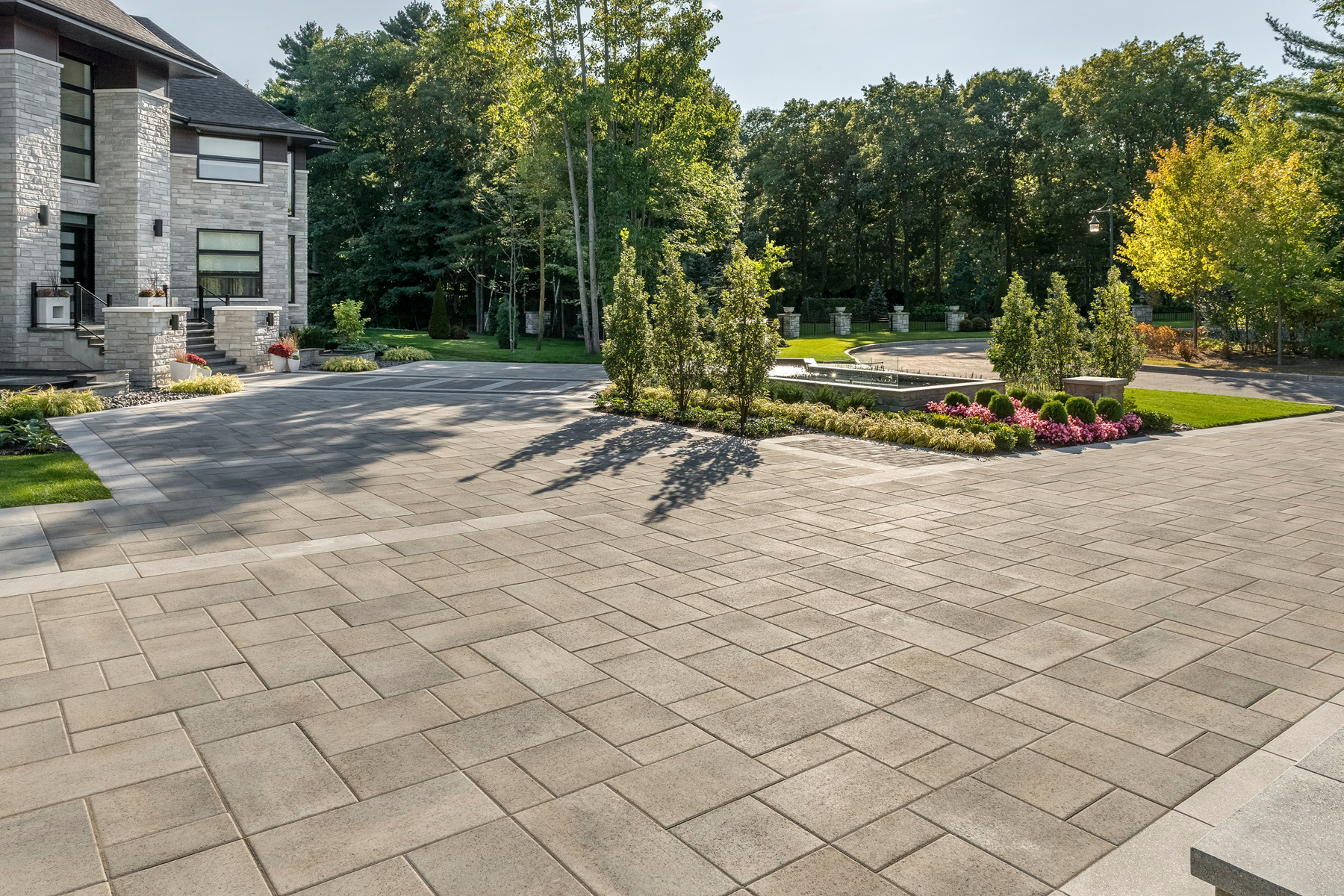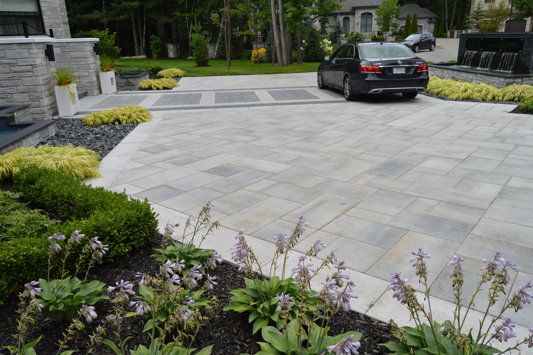Comme l’aménagement des pavés, fontaines et bassins d’eau étaient tous déjà existants, la plantation a été ajoutée à ce style moderne.