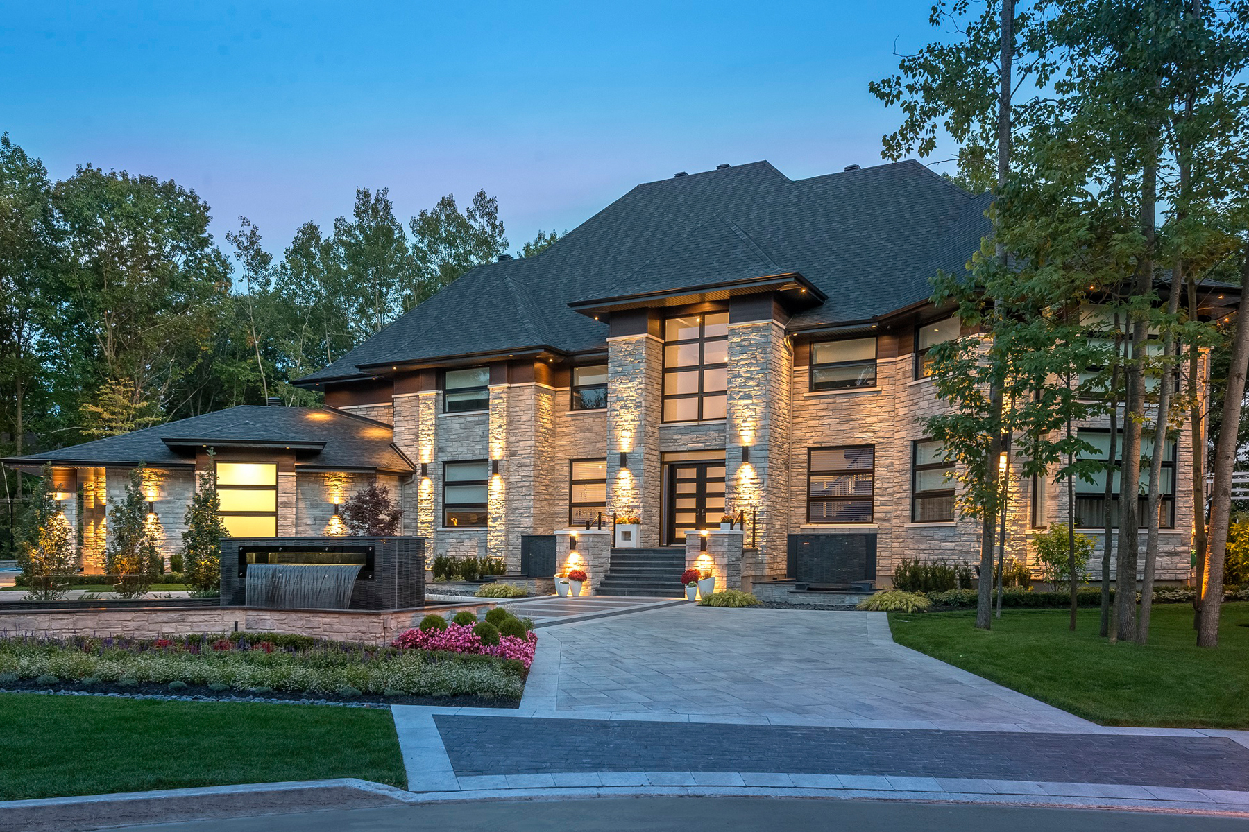 Les arbustes taillés et les annuelles en façade entourent à merveille la magnifique chute d’eau.