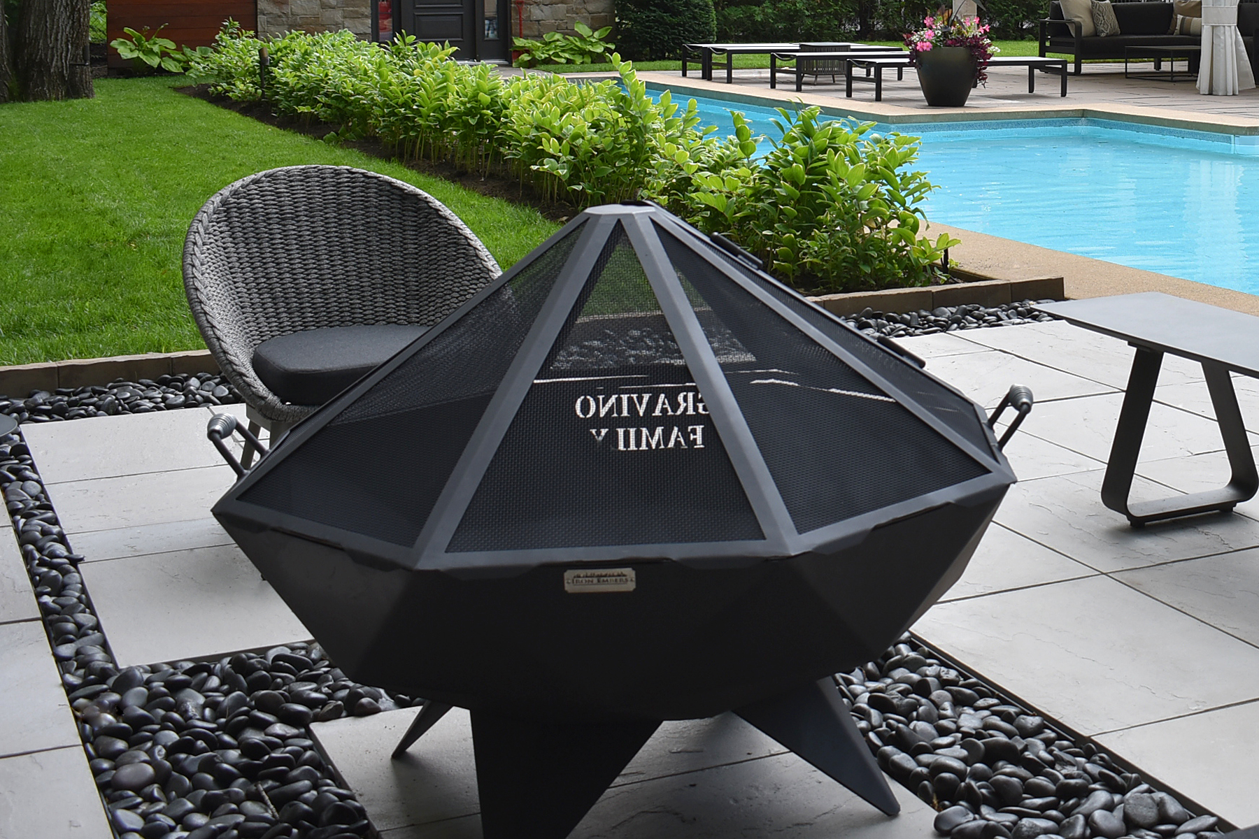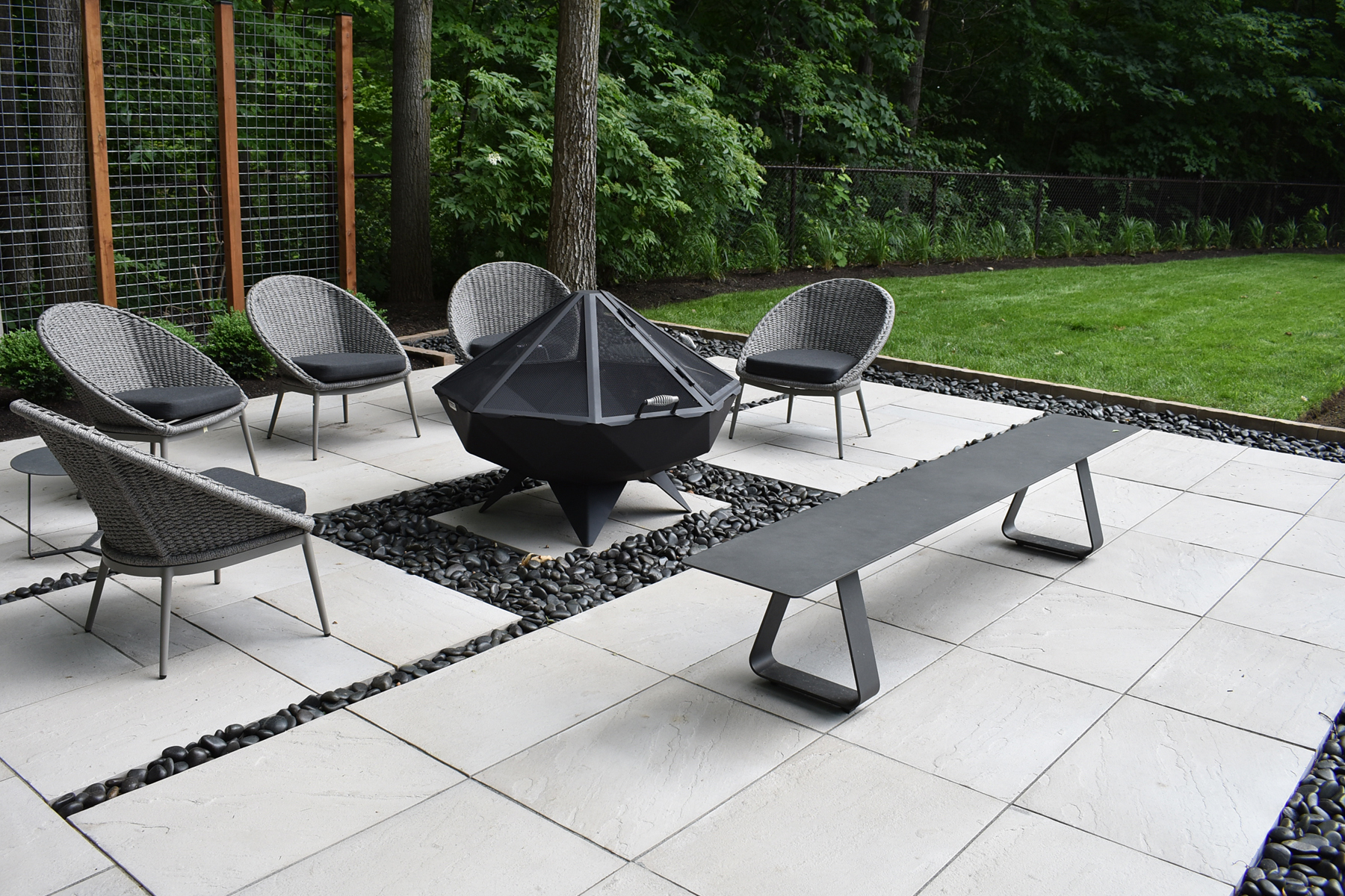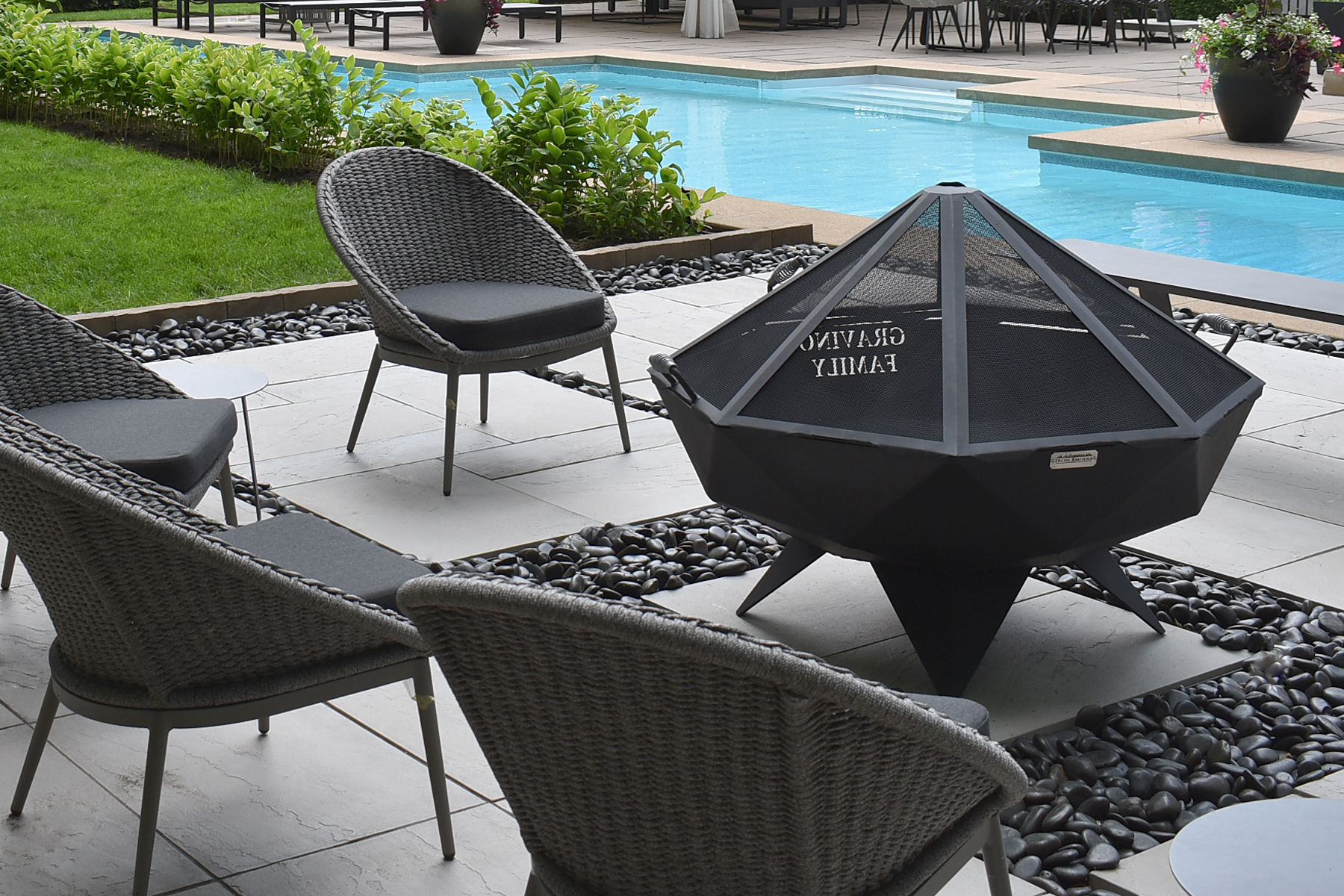 Cet endroit très ombragé, était l’emplacement parfait pour y accueillir un magnifique foyer personnalisé. Les insertions de galets décoratifs polies, ajoutent une touche distinguée à cet espace sublime.