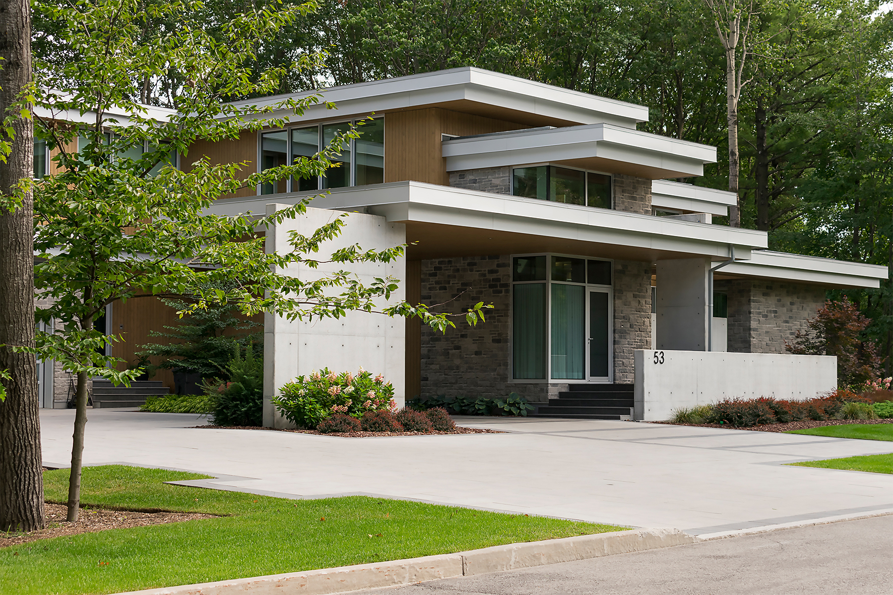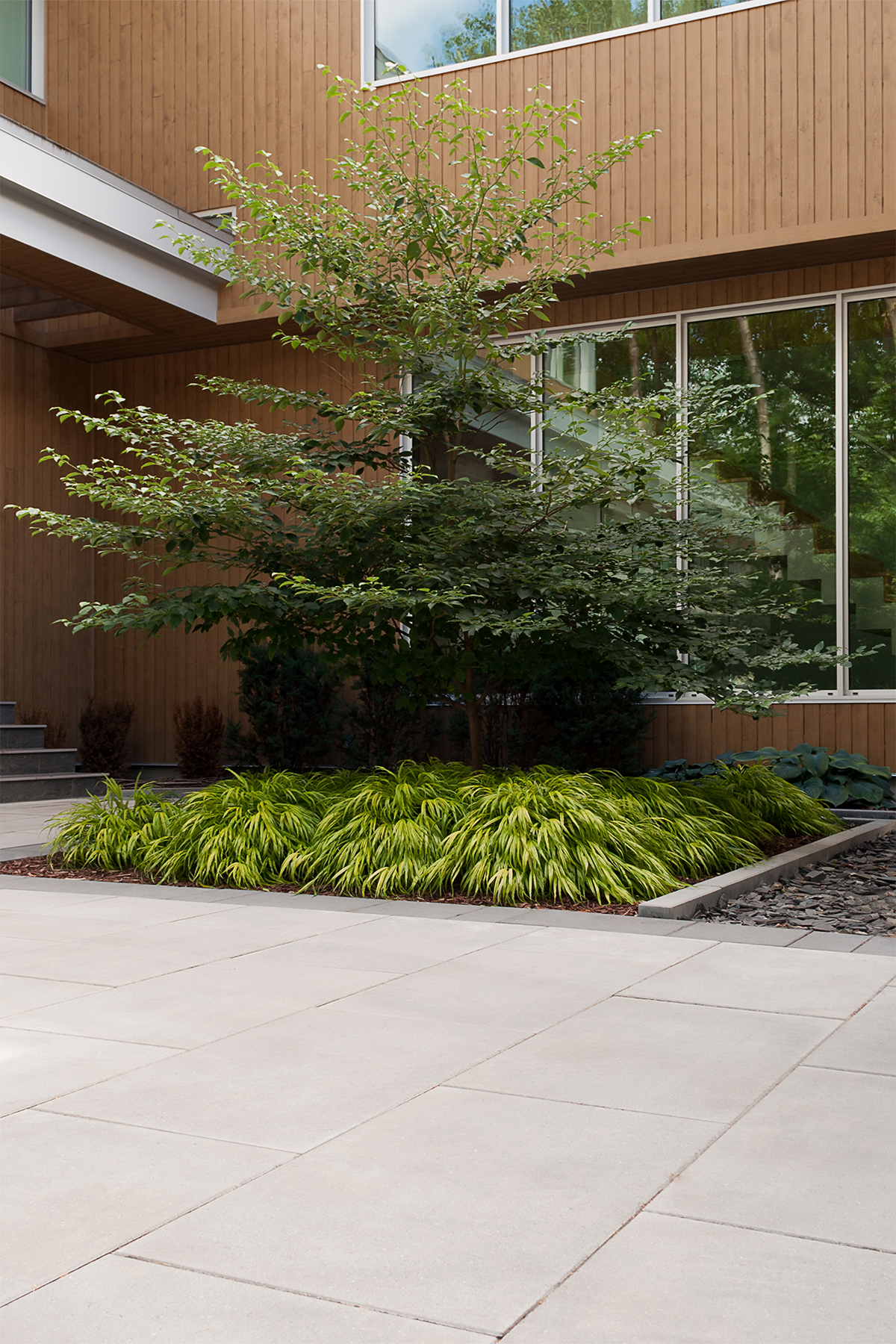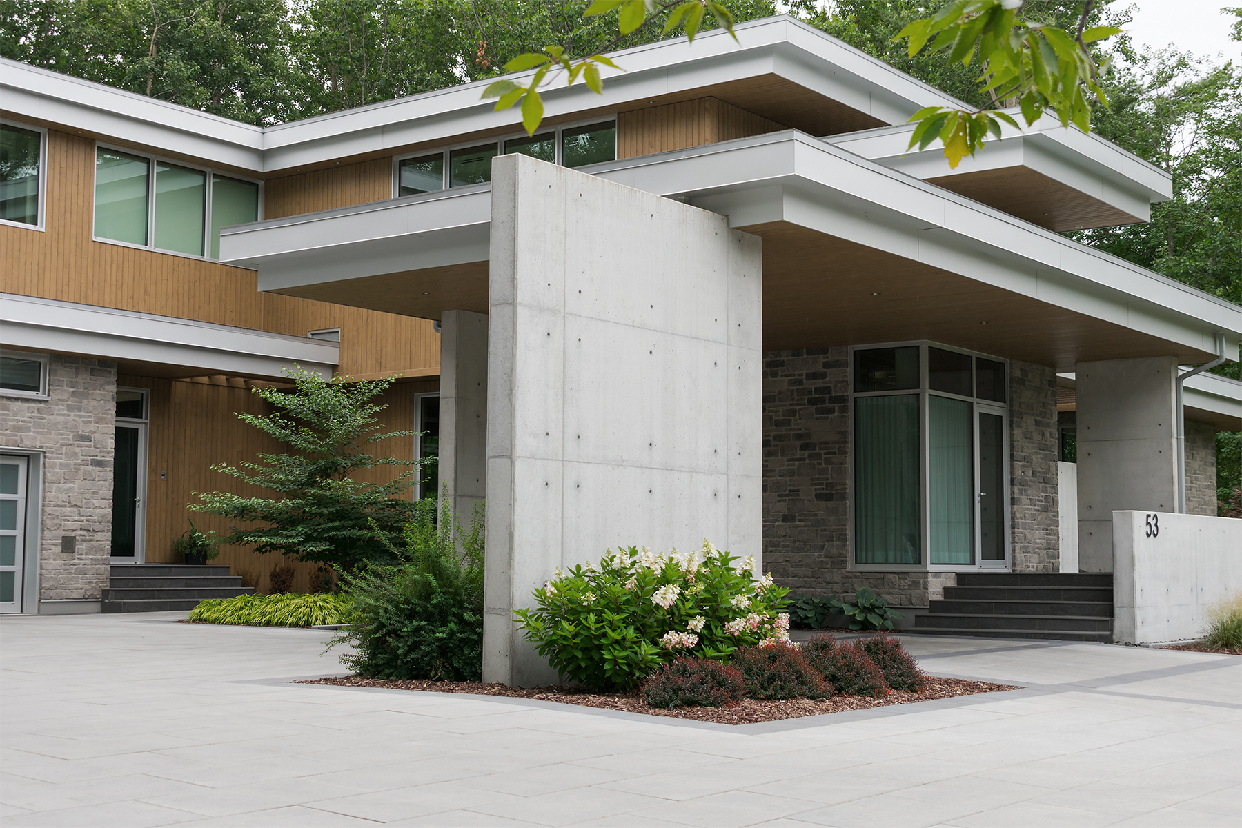 Cette résidence de conception unique à Terrebonne, se devait d’avoir un aménagement prestigieux. Des grands pavés ont été utilisés pour donner un effet grandiose. Le but ici était de mettre en valeur les colonnes de béton rectangulaire, faisant partie intégrante du concept de l’architecture et de la structure du toit.