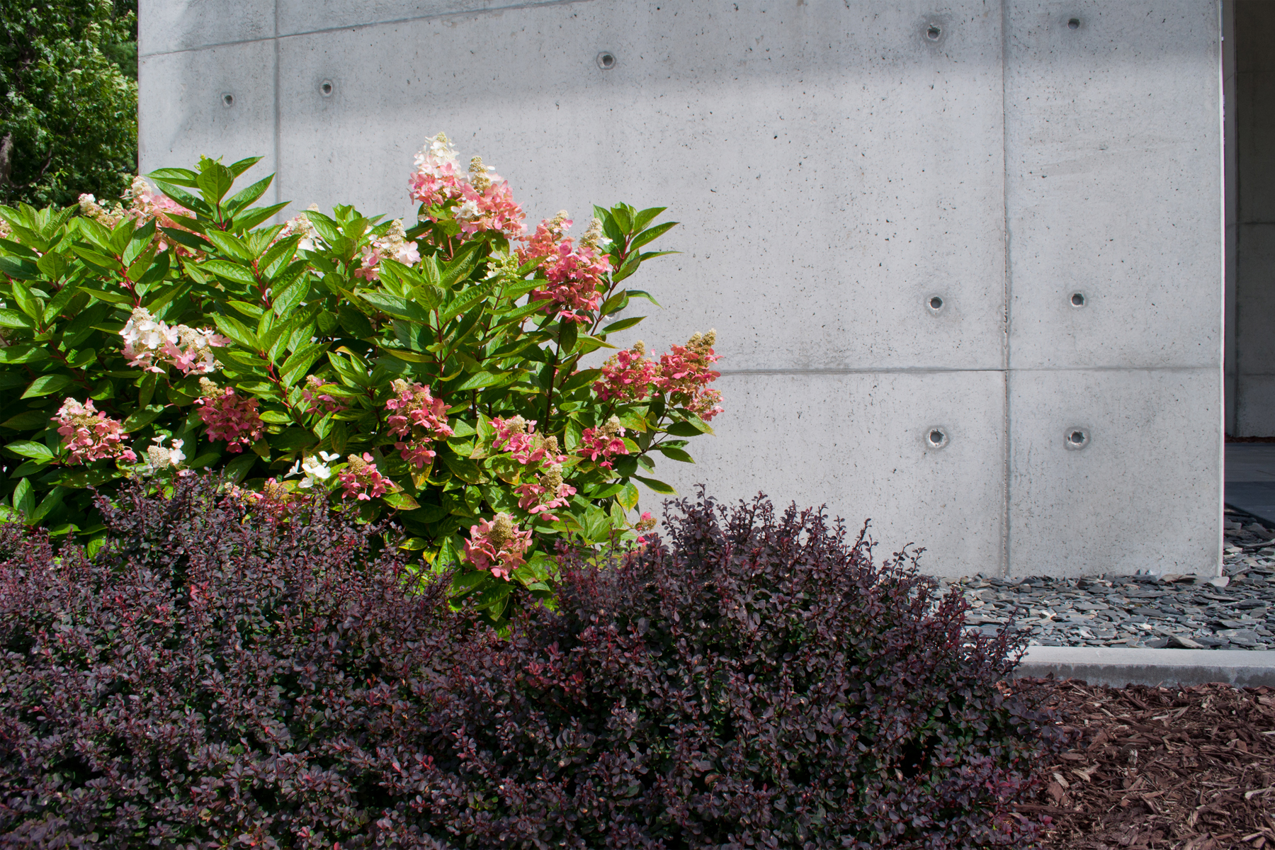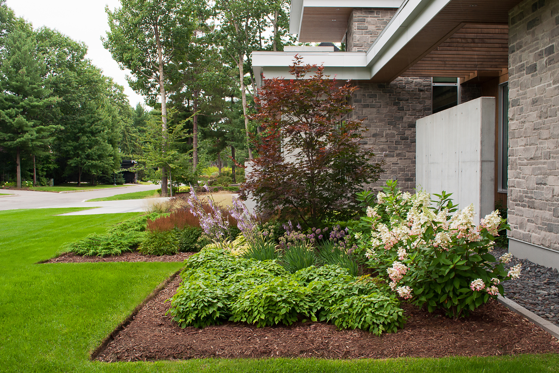 Les lattes de bois de cette résidence apportent chaleur et caractère. La plantation requiert peu d’entretien et a été créée de façon à mettre le bâtiment en valeur.