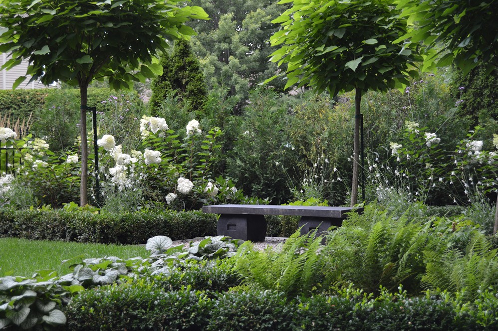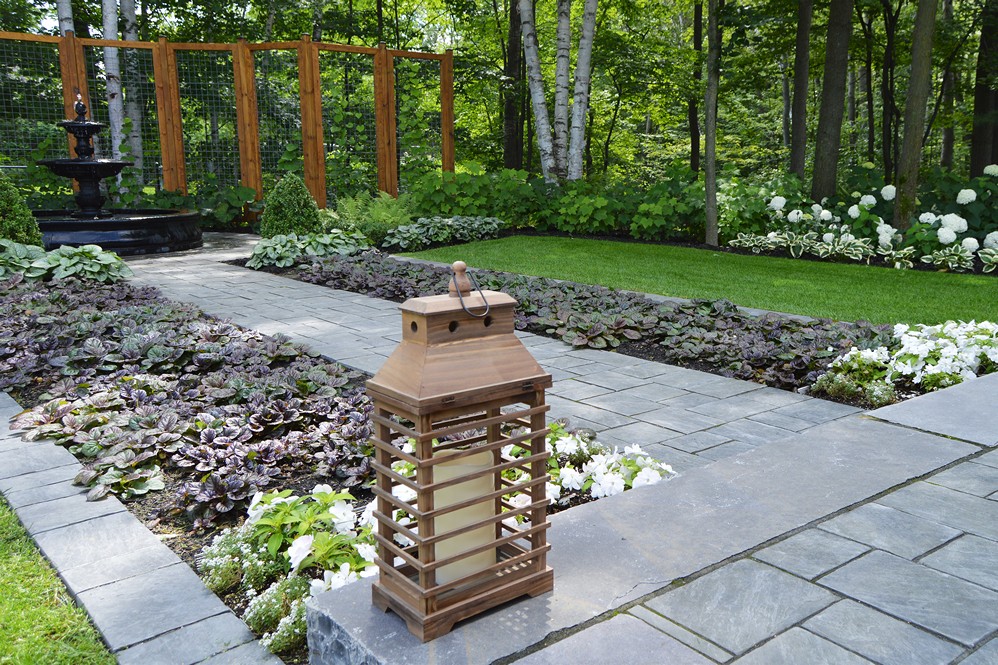 Nous avons donc intégré cette magnifique fontaine de couleur noire au centre du jardin et avons intégré les platebandes, sentiers et aires de repos de façons symétriques soignées.
